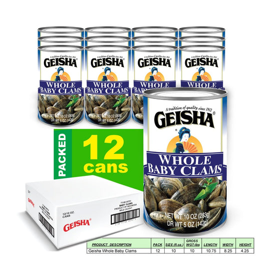 Vendor:GEISHA Whole Baby Clams 10oz (Pack of 12), Baby Clams| No Sugar Added – Wild Caught – Good Source of Protein-Good Source of Iron-Less than 100Kcal per caneeRegular price $1,000,000.00 USDRegular priceUnit price / perSale price $1,000,000.00 USD -