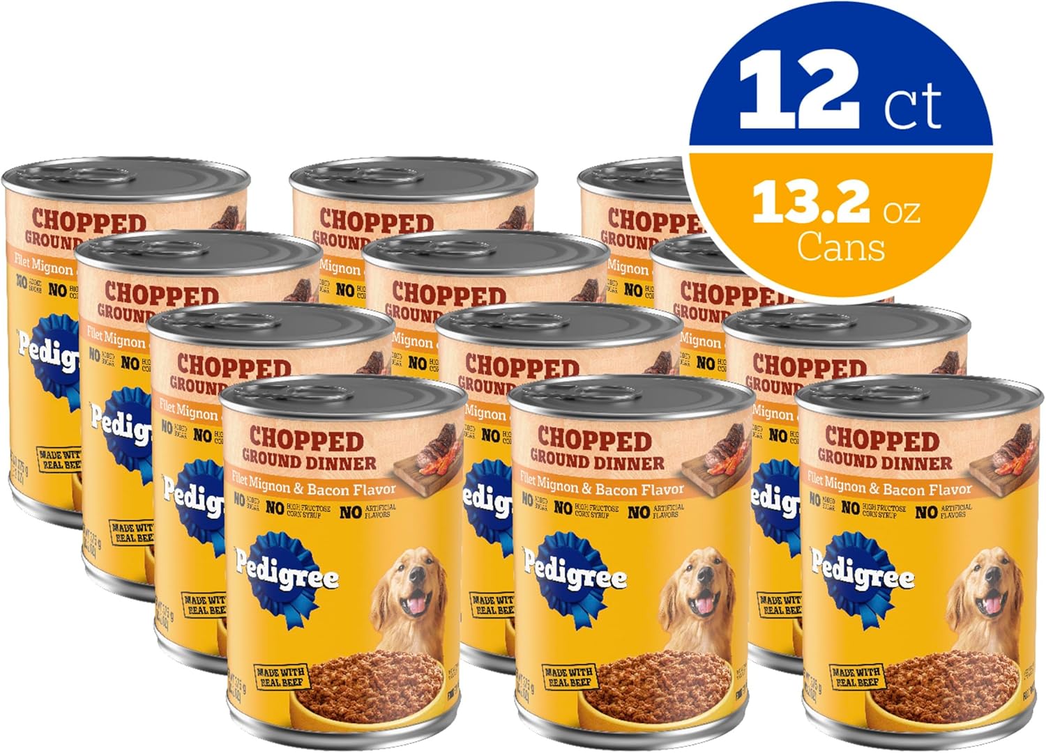 Pedigree Chopped Ground Dinner Adult Wet Dog Food Filet Mignon & Bacon Flavor 13.2 oz. Cans (12 Count, Pack of 1)