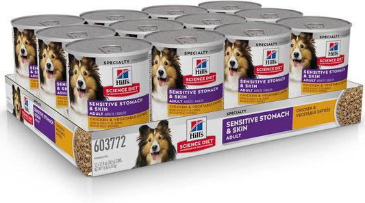 Hill's Science Diet Sensitive Stomach & Skin, Adult 1-6, Stomach & Skin Sensitivity Support, Wet Dog Food, Chicken & Vegetables Loaf, 12.8 oz Can, Case of 12