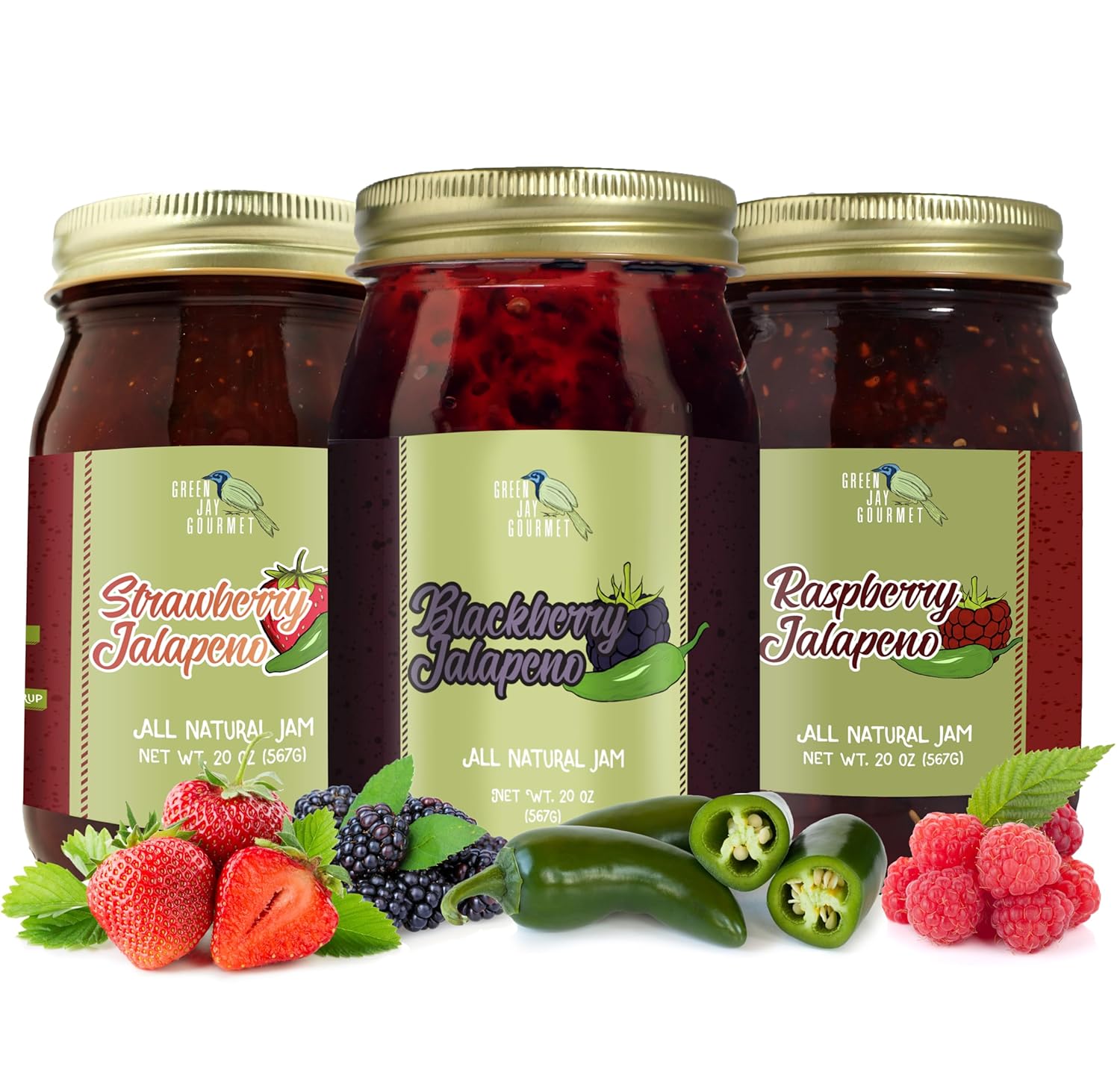 Green Jay Gourmet Spicy Jam Variety Pack - All-Natural Raspberry Jalapeno Jam, Strawberry Jalapeno Jam, Blackberry Jalapeno Jam - Vegan, Gluten-free Jam - No Preservatives - USA Made - 3 x 20 Ounces