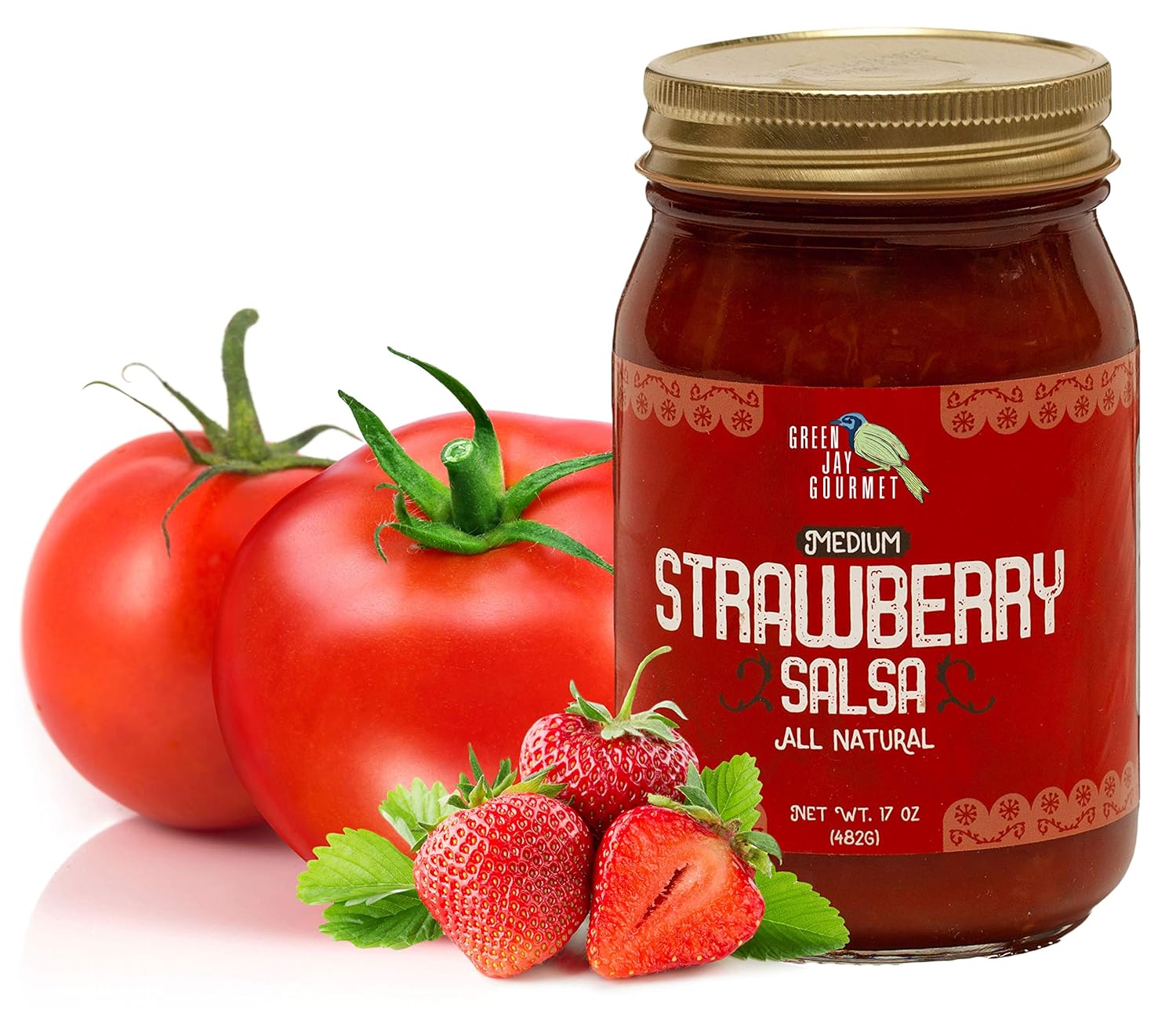Green Jay Gourmet Strawberry Salsa - Strawberry-Flavored Fruit Salsa - Medium Heat Picante Salsa - Gourmet Salsa Dip with No Preservatives - Gluten-Free, Small Batch Natural Salsa Sauce - 17 Ounces
