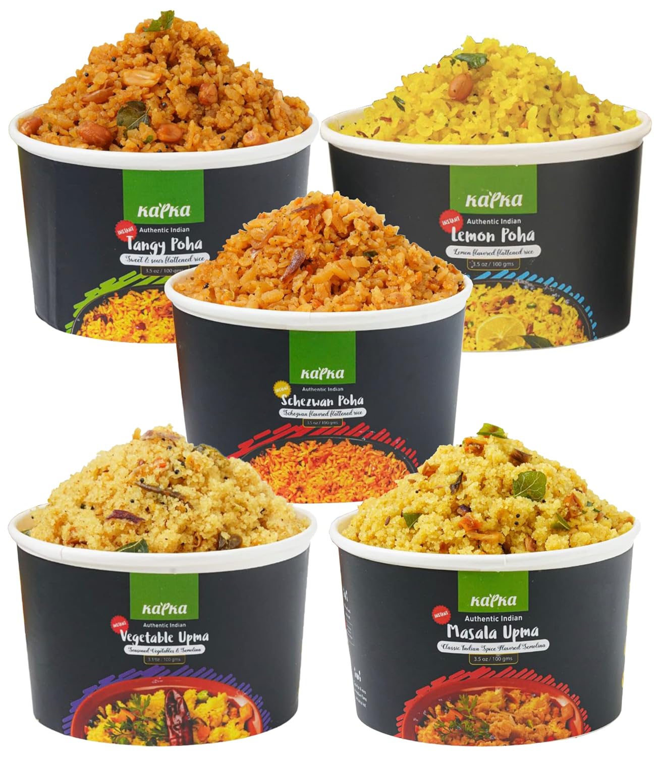 Kapka Assorted Variety Indian Meals - 5 Pack - Ready to Eat Authentic Vegan Prepared Food - Just Add Water - Microwaveable Plant-Based Snacks for Breakfast, Lunch, Non-GMO, No Additives - 3.5oz Each