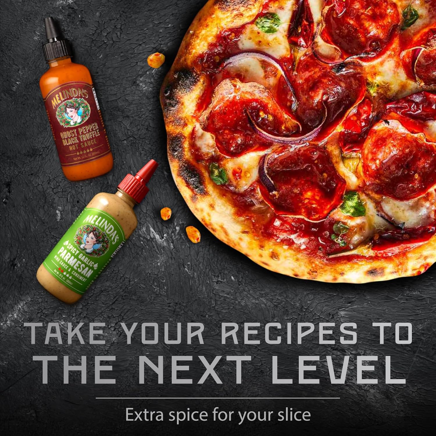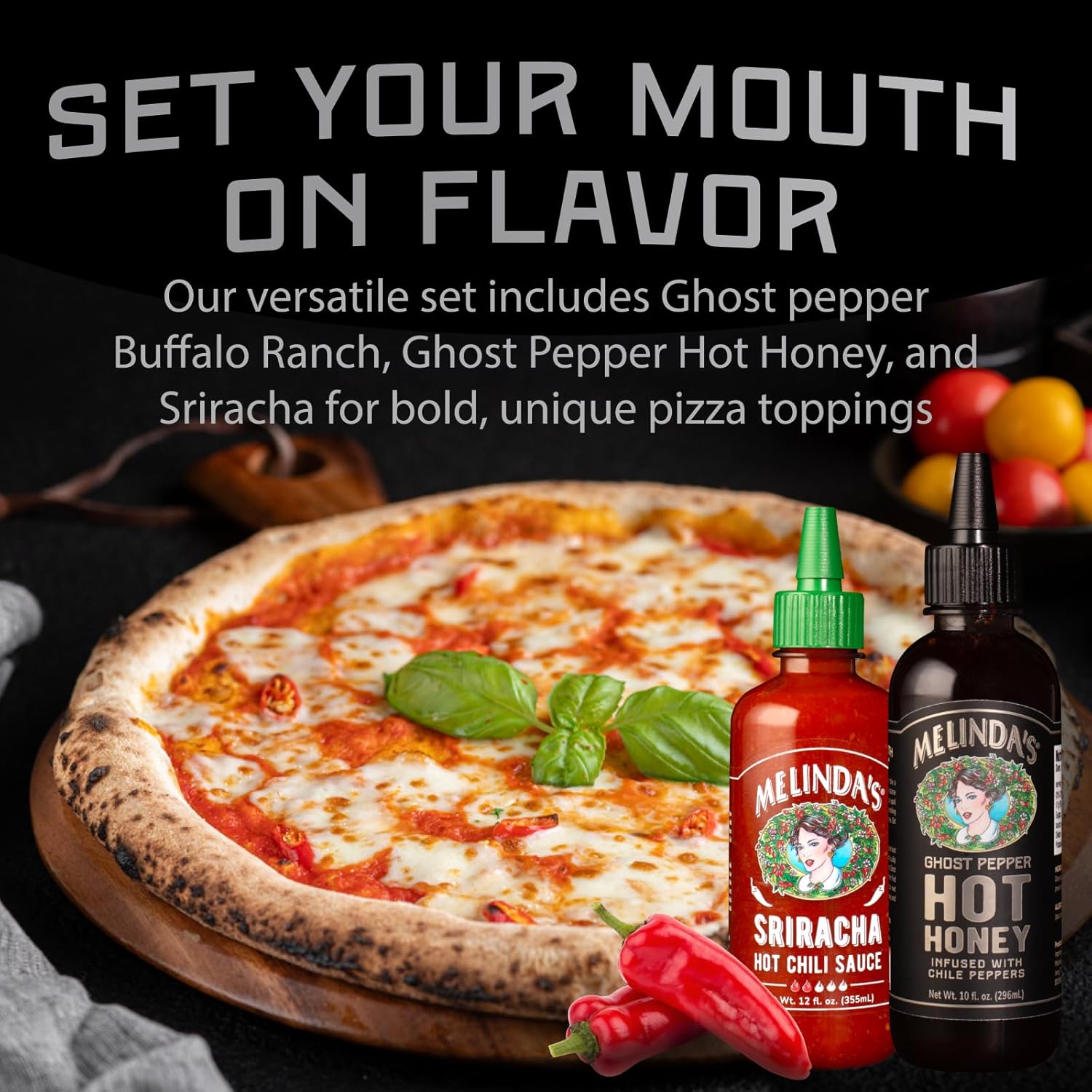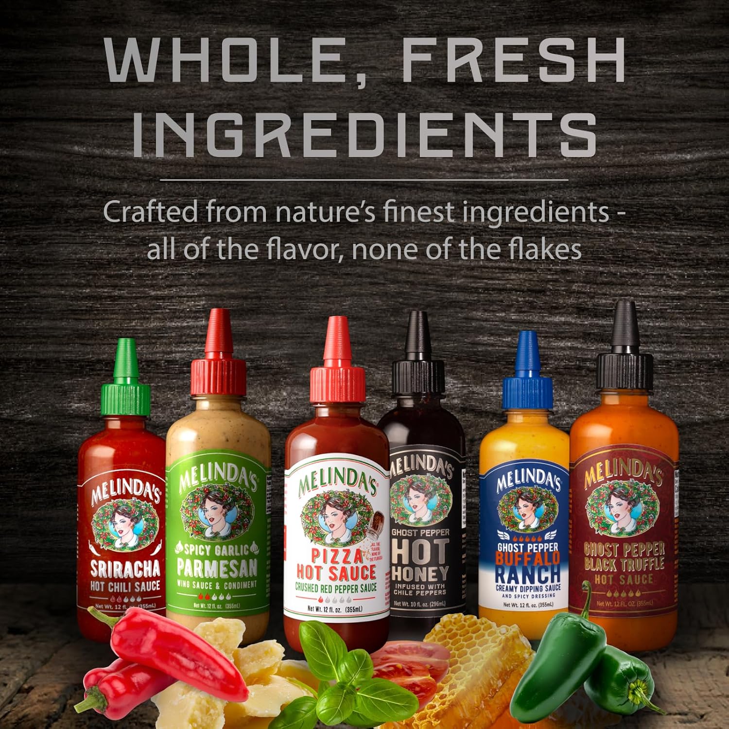 Melinda’s Fiery Pizza Collection - 6 Pack (70 Oz) - Pizza Hot Sauce Gift Set, Ghost Hot Honey, Ghost Black Truffle, Buffalo Ranch & More - Gluten Free, Keto