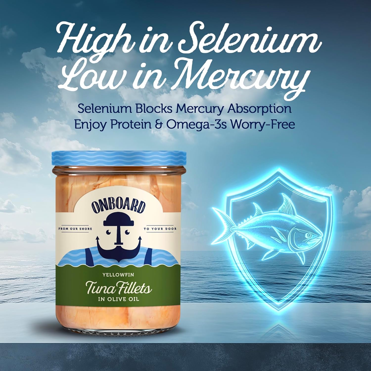 ONBOARD Yellowfin Tuna Fillets, Mediterranean Seafood Diet | Pescatarian Jarred Atun, Fresh Sea Tuna Salad | High in Protein - Healthy Ready-to-Eat Snacks, Packed in Glass Jar | (6 Packs, Olive Oil)