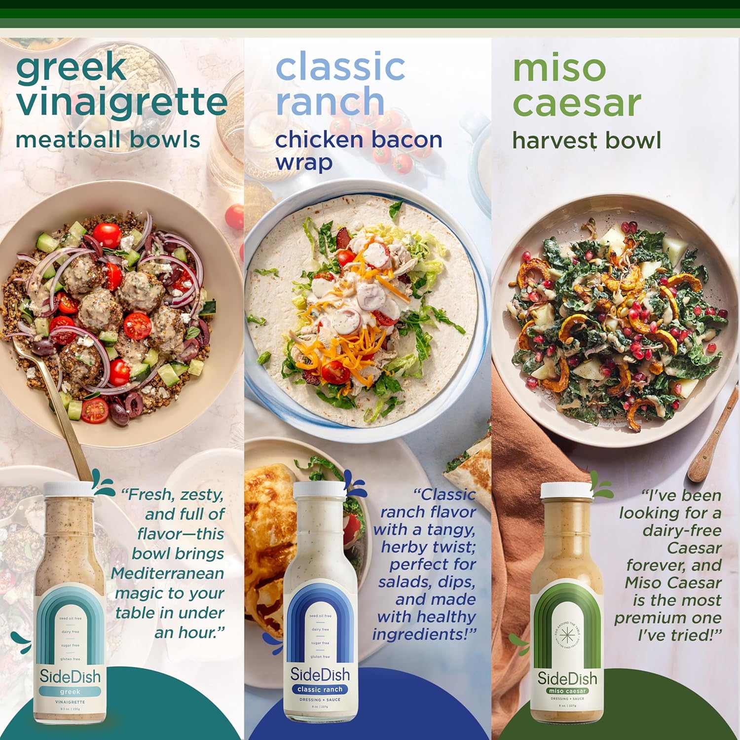 SideDish Healthy Dressing Variety Pack - Classic Ranch, Miso Caesar, Greek Vinaigrette - Seed Oil, Gluten & Dairy Free Salad Dressing w/Avocado Oil - Refined Sugar Free Umami Sauce for Dinner Recipes