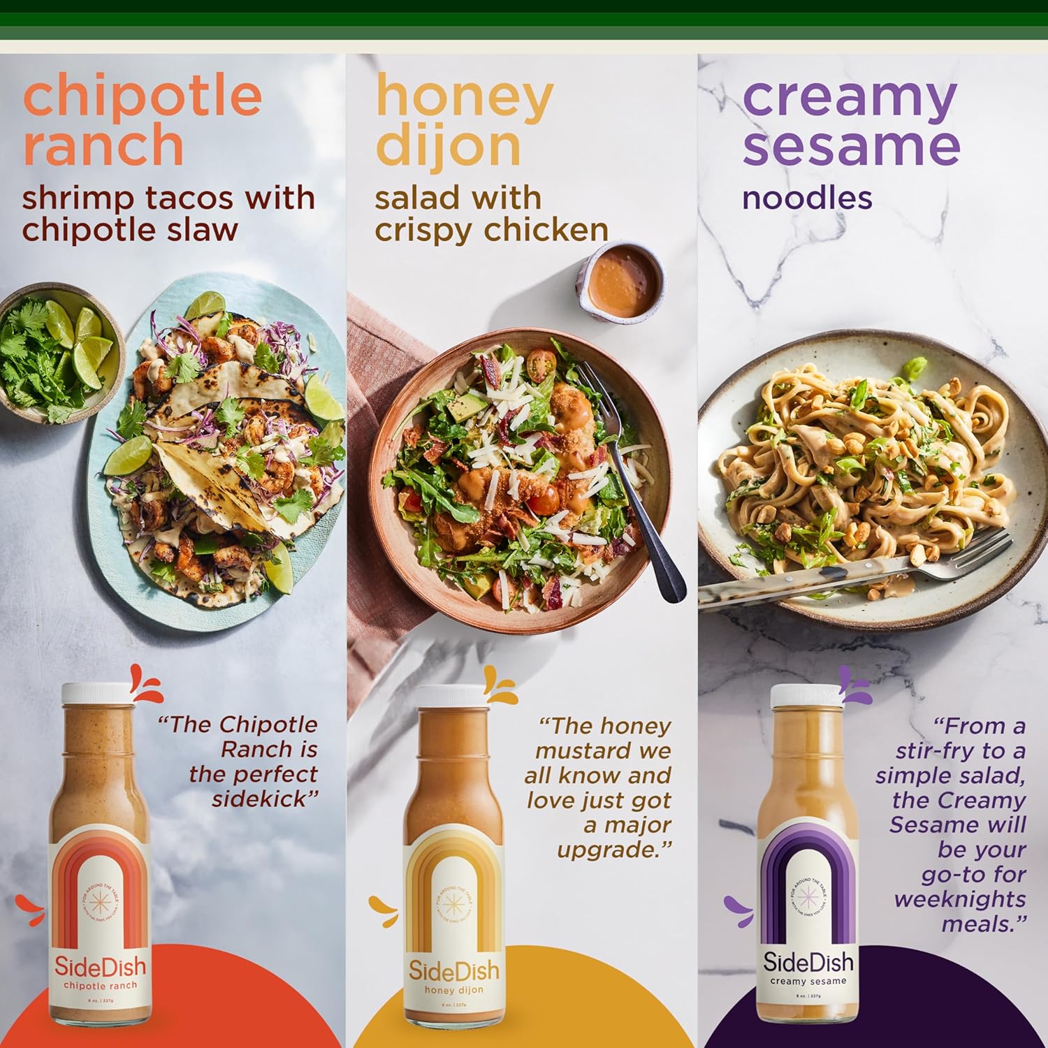 SideDish Salad Dressing Variety Pack (Pack of 3) – Chipotle Ranch, Creamy Sesame, Honey Dijon Made w/Avocado Oil – Healthy, Dairy & Gluten Free Cooking Sauces – Whole30 Dressing for Dips, Sauces