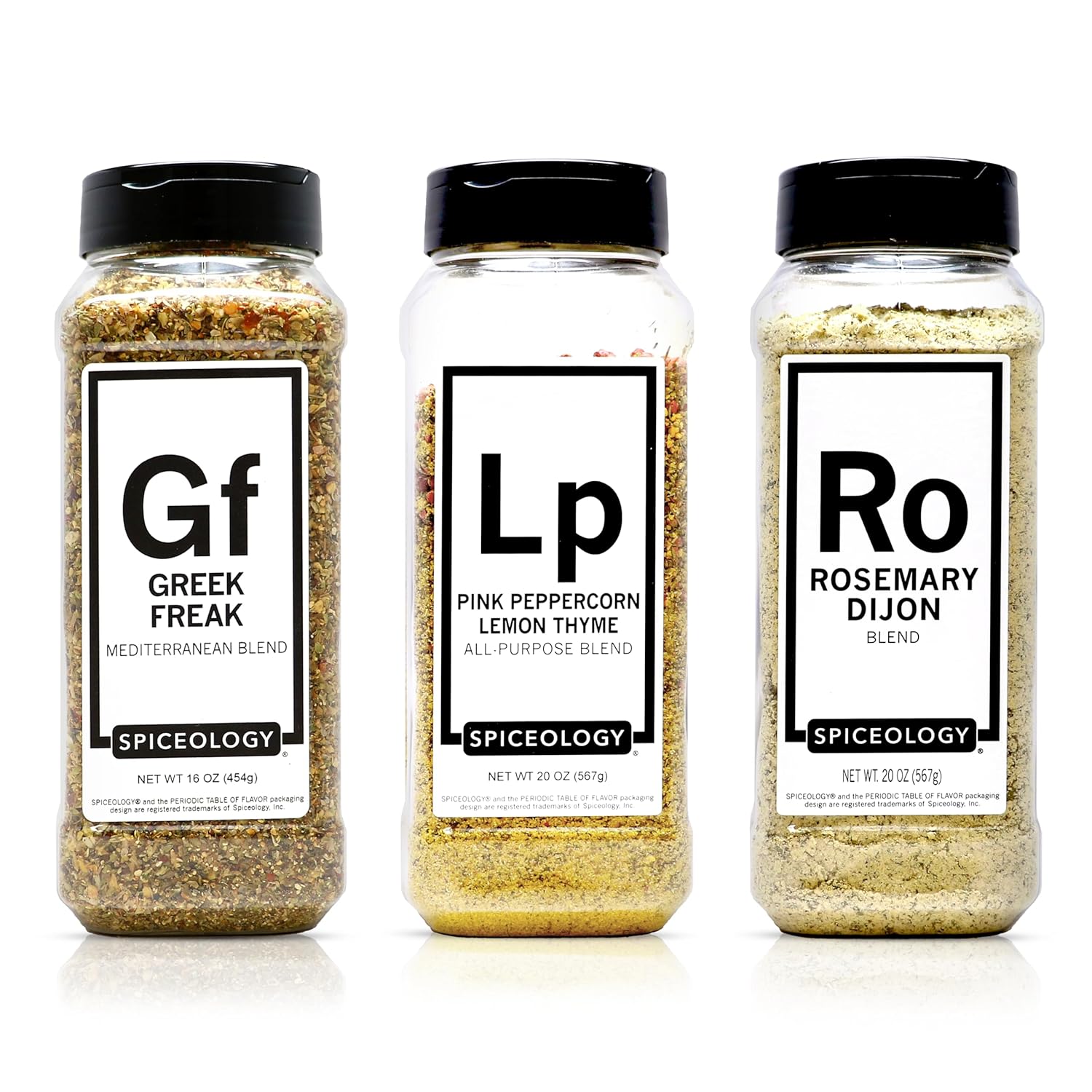 Spiceology - Everyday Entertaining Bundle – Greek Freak, Pink Peppercorn Lemon Thyme, and Rosemary Dijon Seasoning Blends - Gourmet Mediterranean Spices for Chicken, Shrimp, Pasta, and More